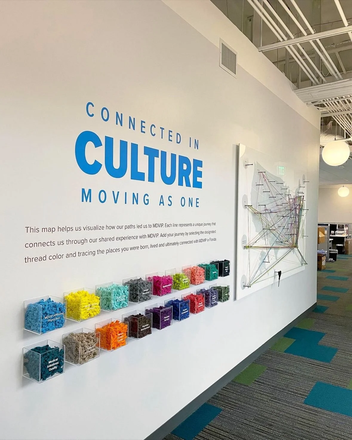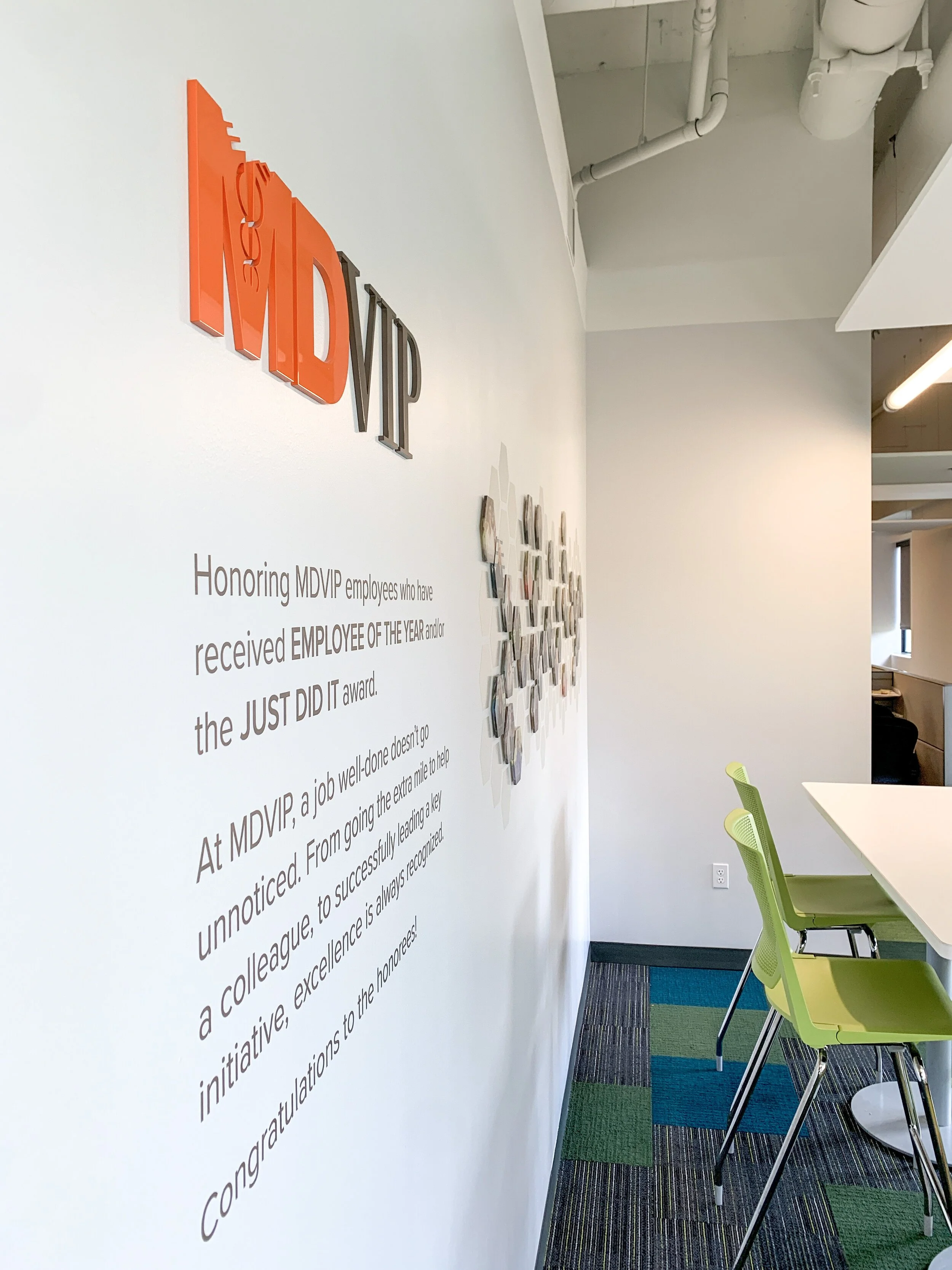 A growing healthcare company was building out their brand new 50,000 square foot Florida headquarters and had a unique opportunity to create an environment that would authentically embody their innovative culture from day one. Leadership wanted the space to reflect their mission and values while inspiring both employees and visitors—going beyond functional signage to create a comprehensive branded experience that would foster engagement, retention and morale.