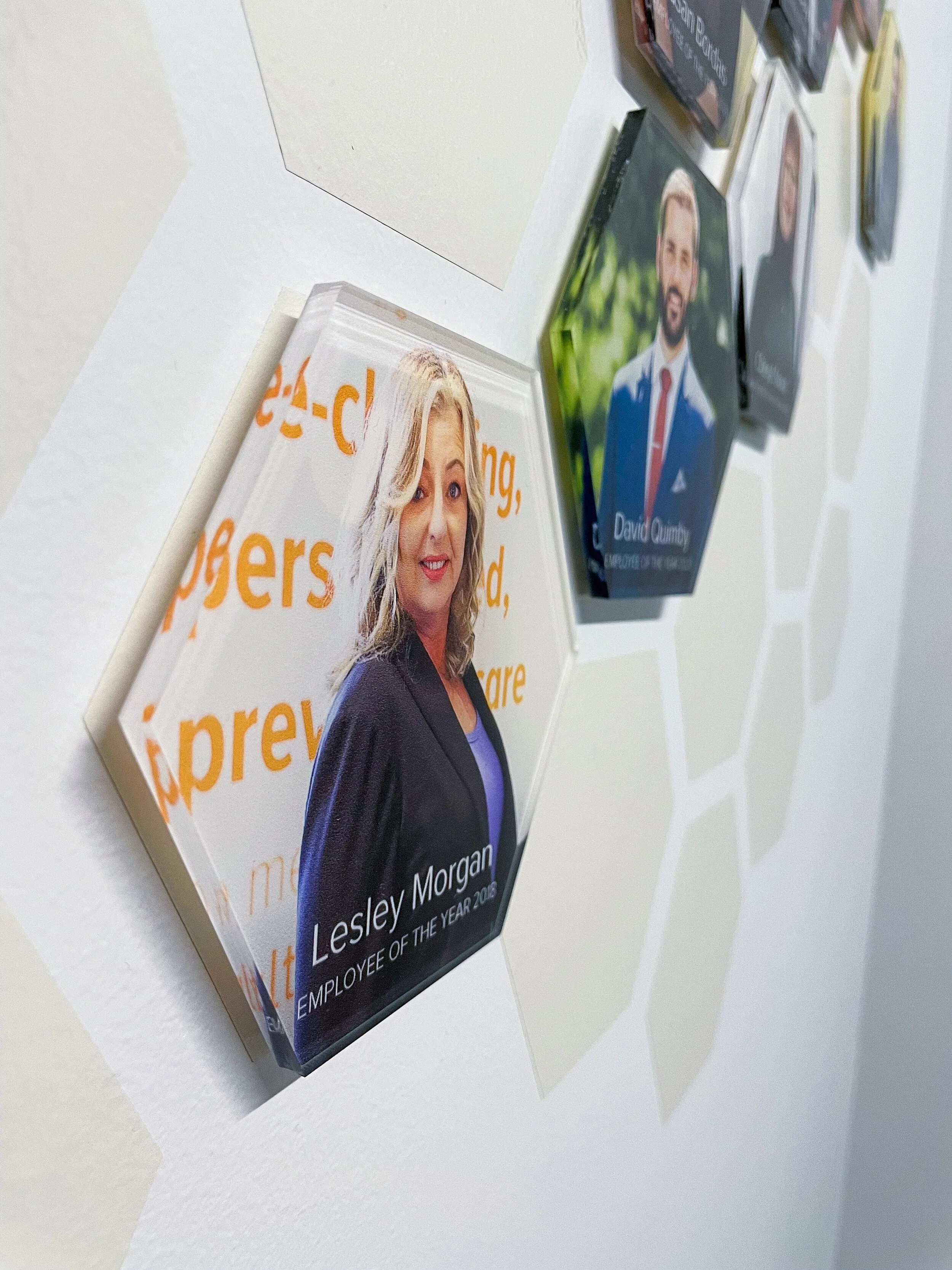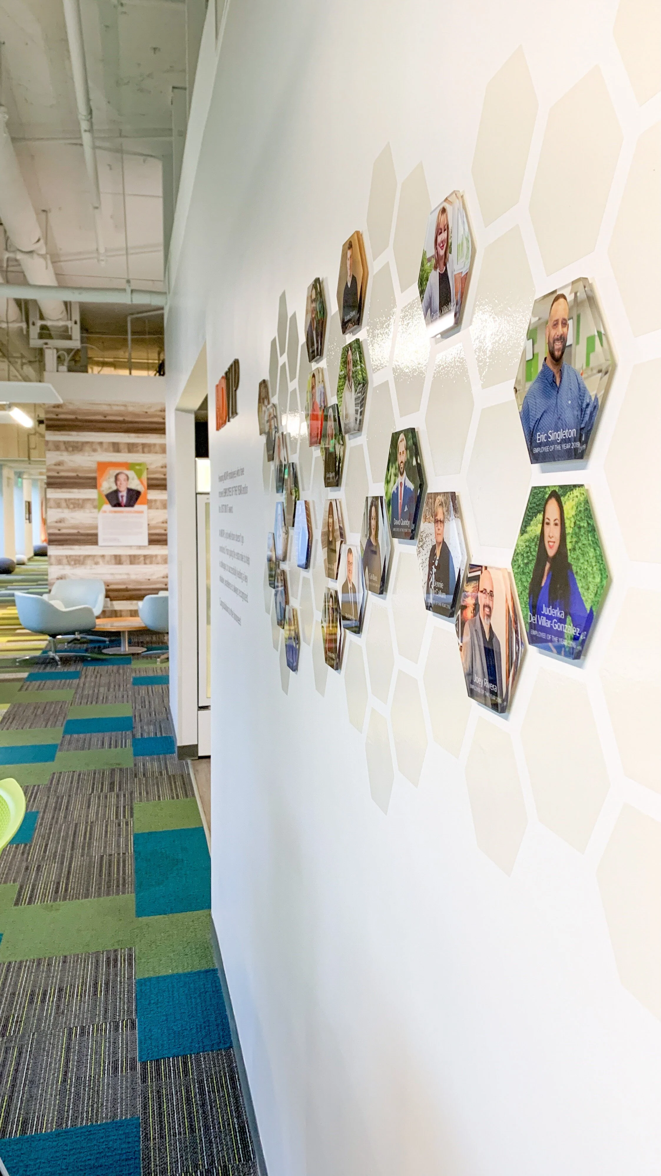 The "Achievement Amplified" employee recognition system uses a modular hexagonal wall where individual accomplishments contribute to an impressive collective display. Each hexagon features employee photography, award details and achievement dates, creating both individual celebration and authentic representation of the company's diverse talent pool.