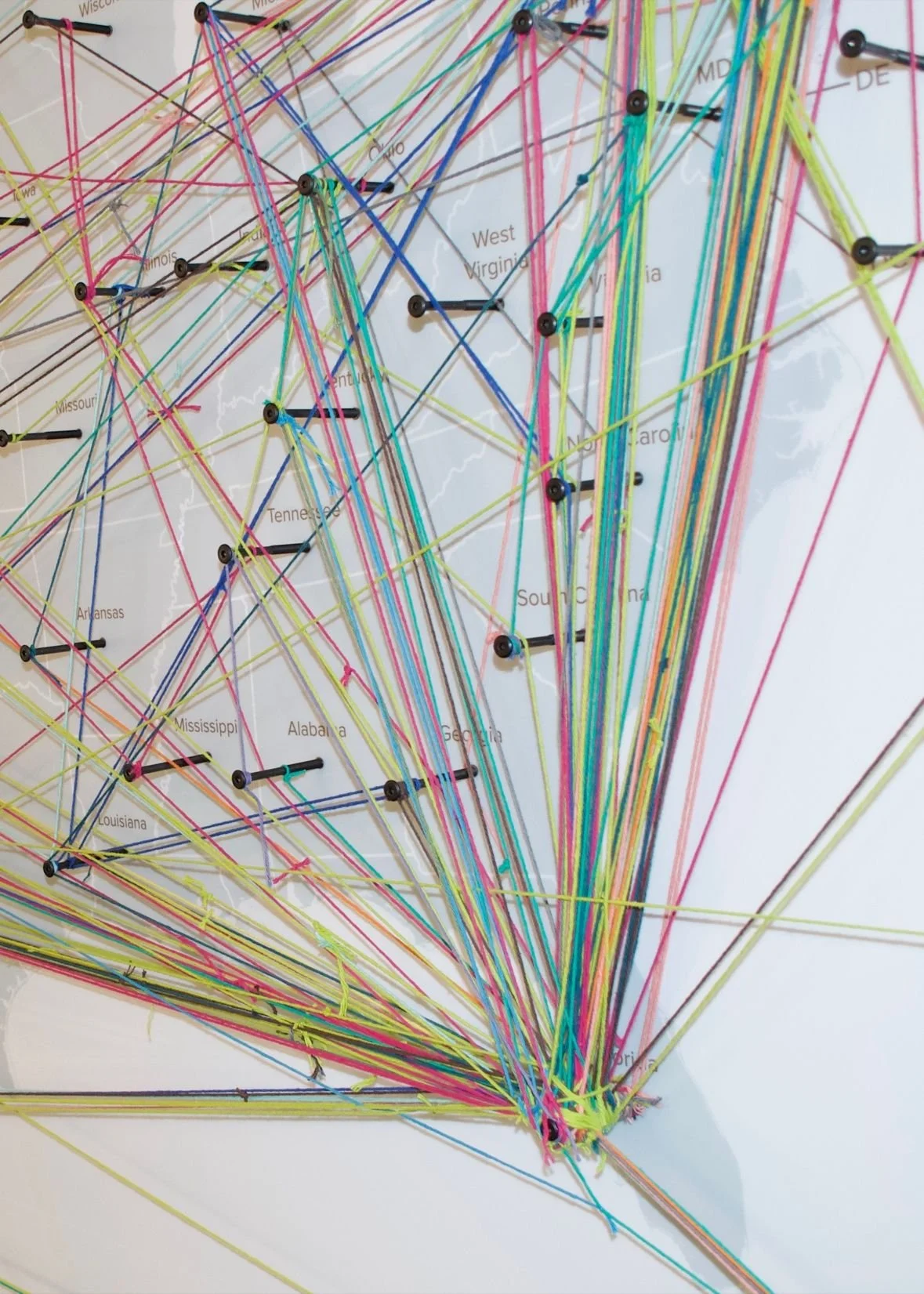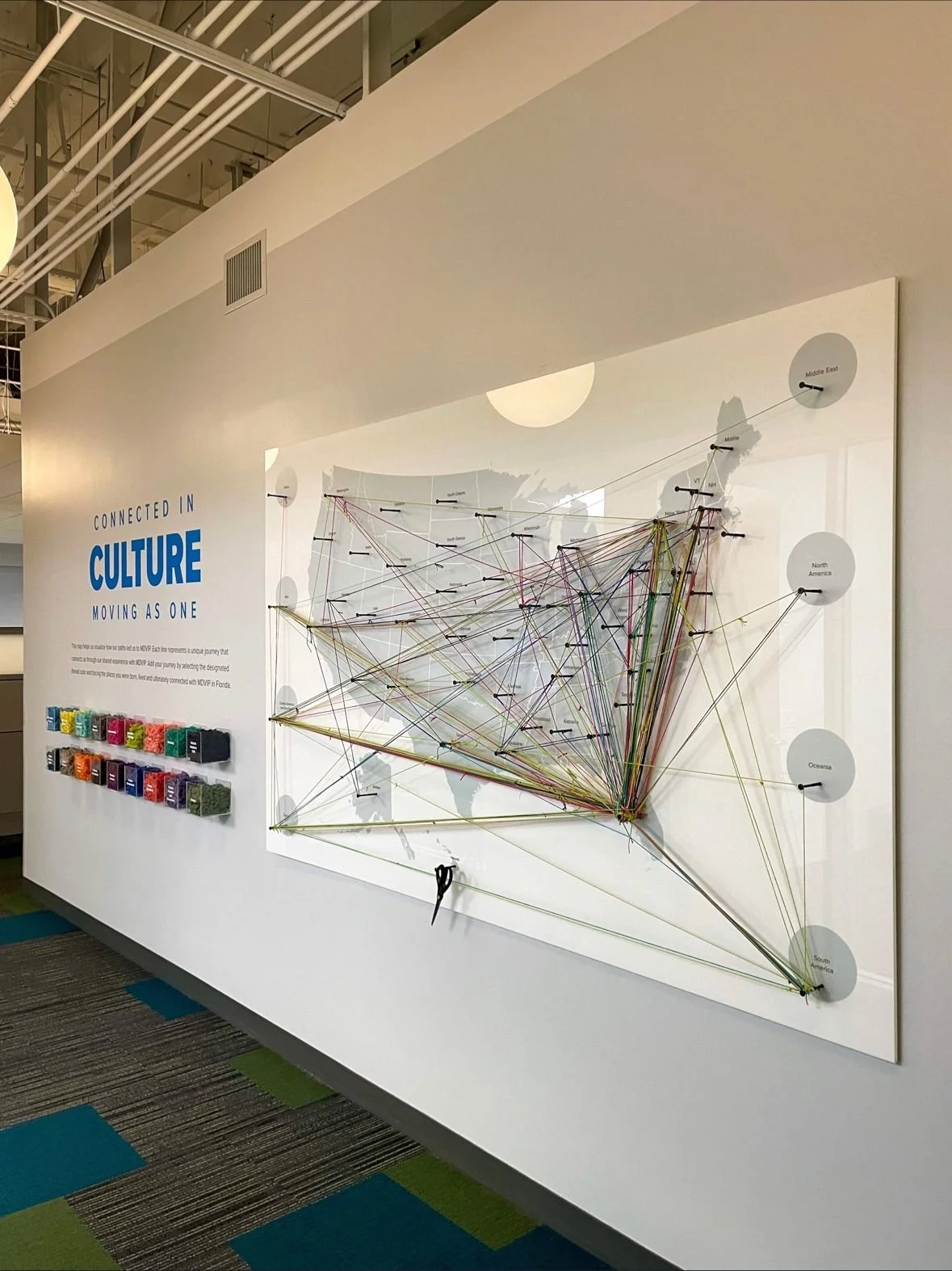 The centerpiece "Connected in Culture" interactive map installation earned a prestigious Gold ADDY award for its innovative approach to showcasing employee diversity and shared experiences. Using designated thread colors, team members trace their journeys from birthplaces through residences to their connection with the organization, creating a visual tapestry of the paths that led each person to the company. This interactive element transforms personal stories into collective culture.